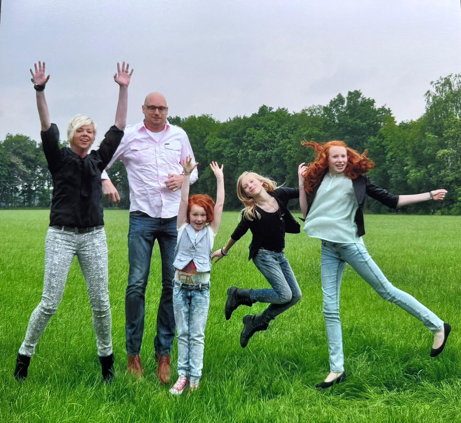Maar hij is ook supertrots op zijn familie! Hij springt net zo hoog als in het veld......, zo blij en enthousiast is hij....